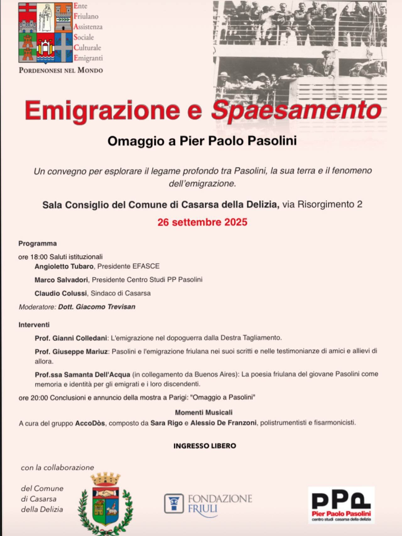 A prendere la parola sarà Gottardo Mitri che offrirà un’analisi storica dell’emigrazione nel dopoguerra dalla Destra Tagliamento. A seguire Giuseppe Mariuz parlerà della presenza del tema migratorio negli scritti e nei ricordi degli amici e allievi del poeta. In collegamento da Buenos Aires, Samanta Dell’Acqua affronterà il ruolo della poesia friulana del giovane Pasolini come memoria e strumento di identità per gli emigrati e i loro discendenti. A conclusione, verrà annunciata ufficialmente l’apertura a Parigi della mostra “Omaggio a Pasolini”, altro progetto curato da EFASCE.