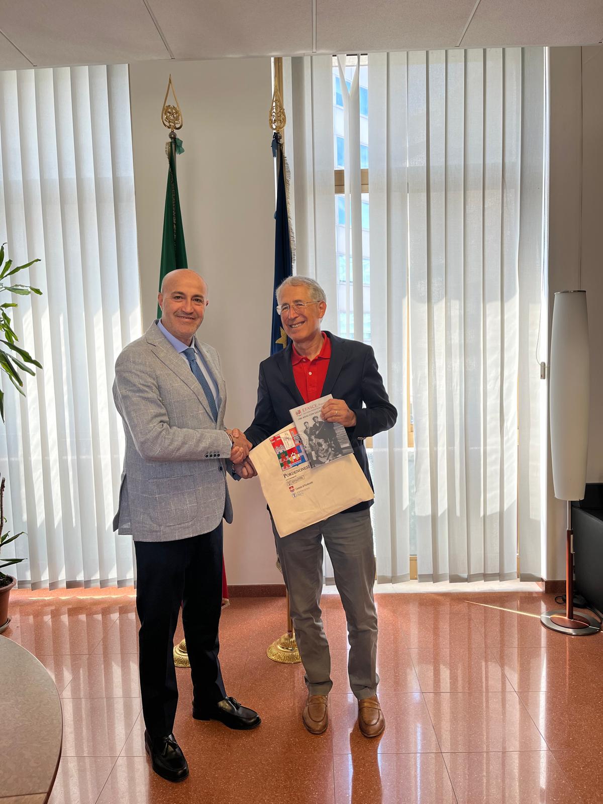 Questo il messaggio portato dal Presidente di EFASCE Pordenonesi nel Mondo Angioletto Tubaro al Prefetto di Pordenone Michele Lastella in un incontro cordiale che si è svolto in Prefettura a Pordenone. Presente anche il Capo di Gabinetto Michael Mastrolia. Con l’occasione Tubaro ha donato al Prefetto il libro sulla storia di EFASCE (Ente fondato nel 1907) e le recenti pubblicazioni della collana Testimoni, dedicata ai diari degli emigranti.